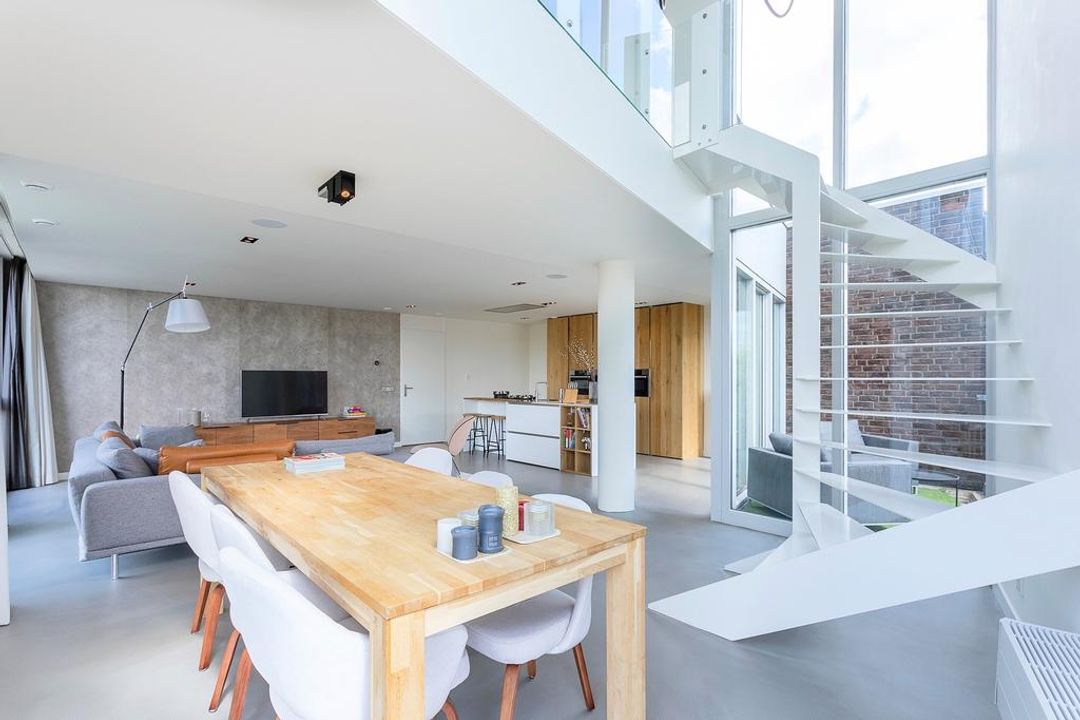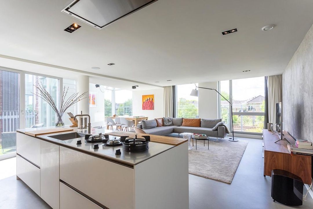 House entrance; spacious hall with access to 2 bedrooms with fitted wardrobes, a bathroom with a modern bathroom with shower, sink and underfloor heating, spacious laundry room and toilet. At the end of the hall you enter the living room with the large glass areas, balcony (south) and loft. The space is unique by Amsterdam standards and offers a lot of comfort. The same can be said of the luxury kitchen, which is equipped with a cooking island, steam oven, oven, built-in coffee maker, Quooker, dishwasher, refrigerator and extractor in the ceiling. Furthermore, the living room has air conditioning, built-in speakers and Modular spots. The custom thin steel staircase and glass balustrade connect the 4th and 5th floors. This floor is furnished as an office and second living room and turns into the master bedroom with built-in wardrobe and ensuite bathroom with a freestanding bath, walk-in shower, toilet, underfloor heating and furniture with Moab sink.