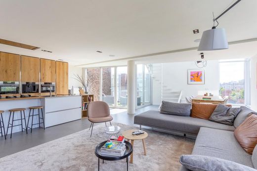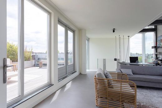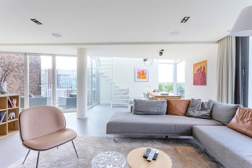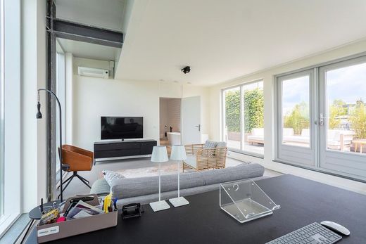 Modern and light double-corner apartment (168 m2) with terrace (36 m2), balcony (7 m2), located on the top floor (s) of the apartment complex (with elevator) "de Borneodriehoek", designed by studio Zeinstra en Van der Pol. The complex received the Zuiderkerk Prize, the Amsterdam incentive prize for the most innovative housing project. The house with parking space and bought-off leasehold is characterized by many windows (with an area of ??approximately 100 m2) that reach up to the ceiling with the effect of a wide view and yet with a lot of privacy.